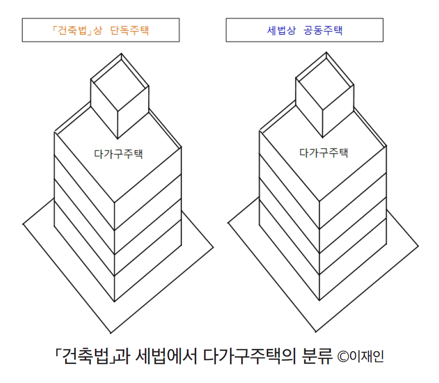 반면 세법상으로 다가구주택공동주택으로 분류하는 이유는 만일 다가구주택을 「건축법」과 같은 시각으로 분류하게 된다면, ‘고급주택’으로 분류되어 중과세를 부과하도록 규정하고 있기 때문에,